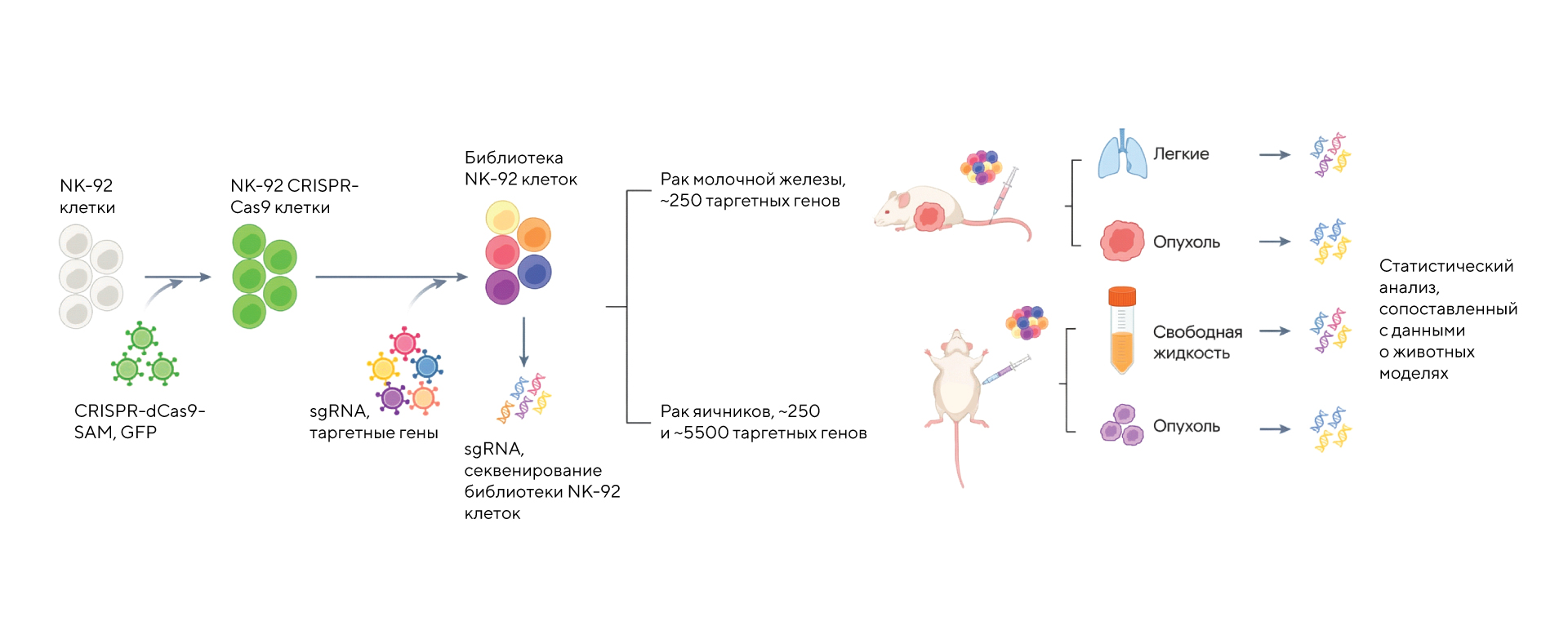Экспериментальная схема скрининга методом CRISPR in vivo; исследователи изучали результаты на мышиных моделях, которым делали инъекции внутривенно, внутрибрюшинно и подкожно. Источник: адаптировано из Nature