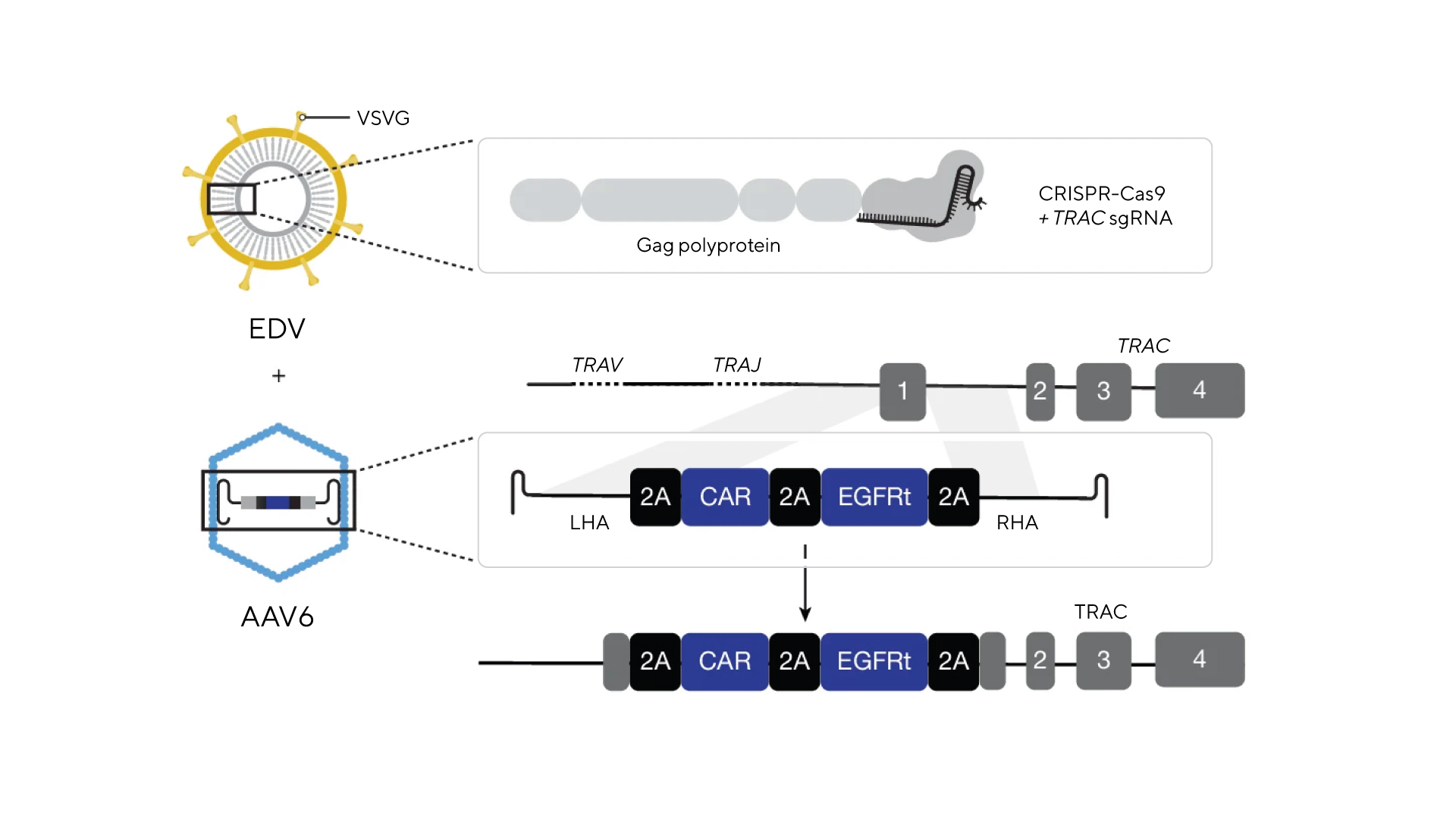 Схема эксперимента: для доставки элементов в организм использовались VSV-G WT (гликопротеины оболочки вируса везикулярного стоматита «дикого типа») и аденоассоциированные вирусы, а сама вставка происходила в локус TRAC, обеспечивающий физиологичную и контролируемую экспрессию CAR. Источник: Nature