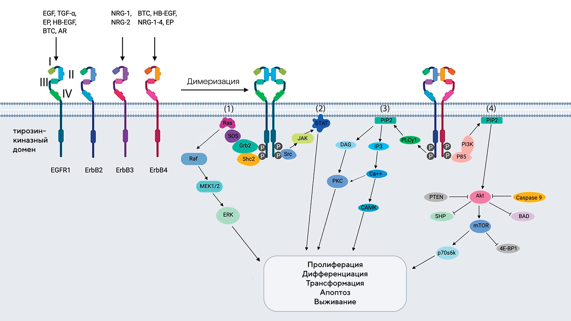 Схематическое представление четырех различных рецепторов (EGFR1, ErbB2, ErbB3, ErbB4), ассоциированных с раком молочной железы. Источник: MDPI