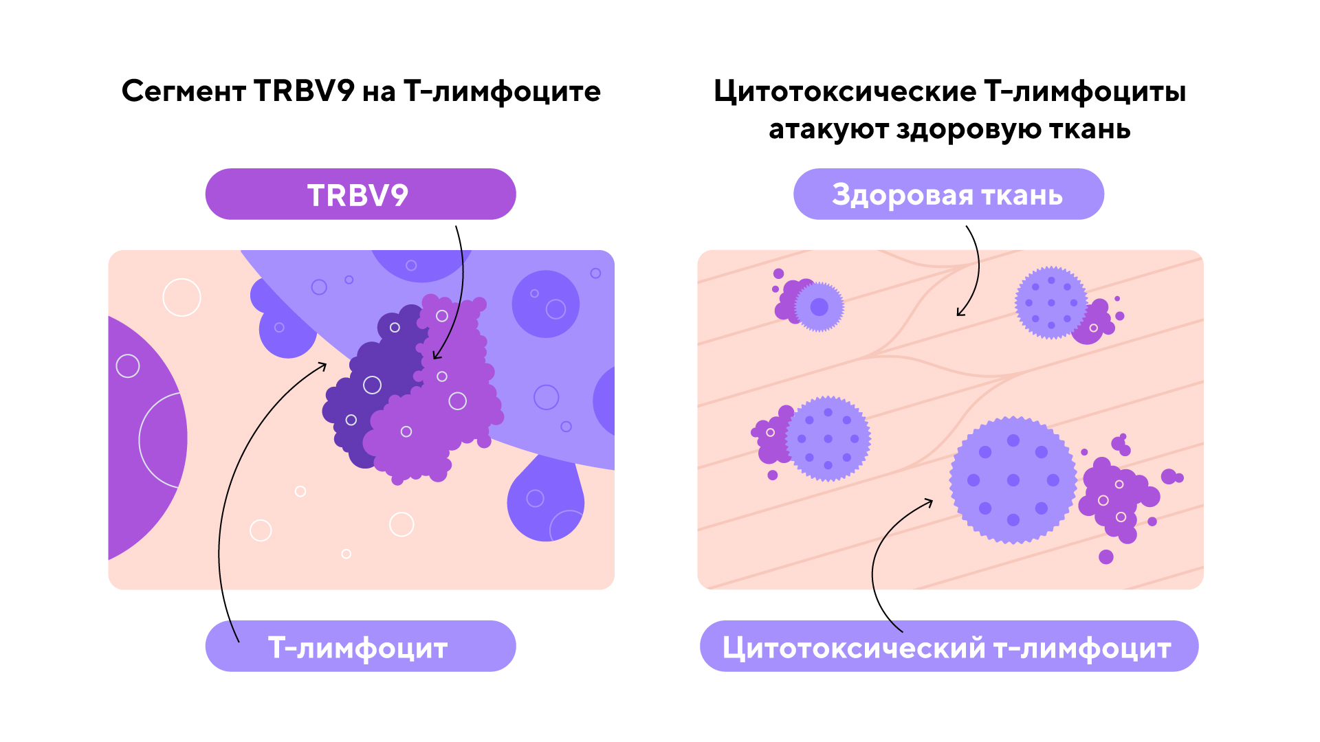 Механизм действия Трибувиа® принципиально отличается от препаратов других классов. Сенипрутуг — моноклональное антитело к рецепторам аутореактивных Т-лимфоцитов. Такие лимфоциты привлекают и активируют другие иммунные клетки, вследствие чего запускается синтез провоспалительных цитокинов. Исследователи выяснили, что у рецепторов аутореактивных Т-лимфоцитов есть одинаковый сегмент TRBV9. Именно на него и направлено прицельное действие сенипрутуга. Его молекулы способны уничтожать цитотоксические Т-лимфоциты с TRBV9, то есть инициальное звено иммуновоспалительного каскада.