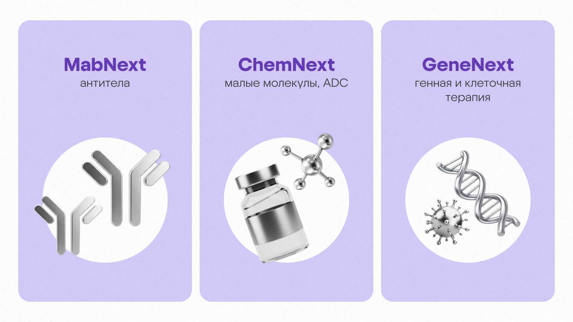 BIOCAD активно развивает несколько ключевых направлений ранней разработки терапевтических препаратов. Для этого мы работаем в рамках трех технологических платформ: MabNEXT — разработка моноклональных антител, ChemNEXT — разработка малых молекул и ADC, цитотоксических конъюгатов антител, а также GeneNEXT — разработка препаратов для генной и клеточной терапии.