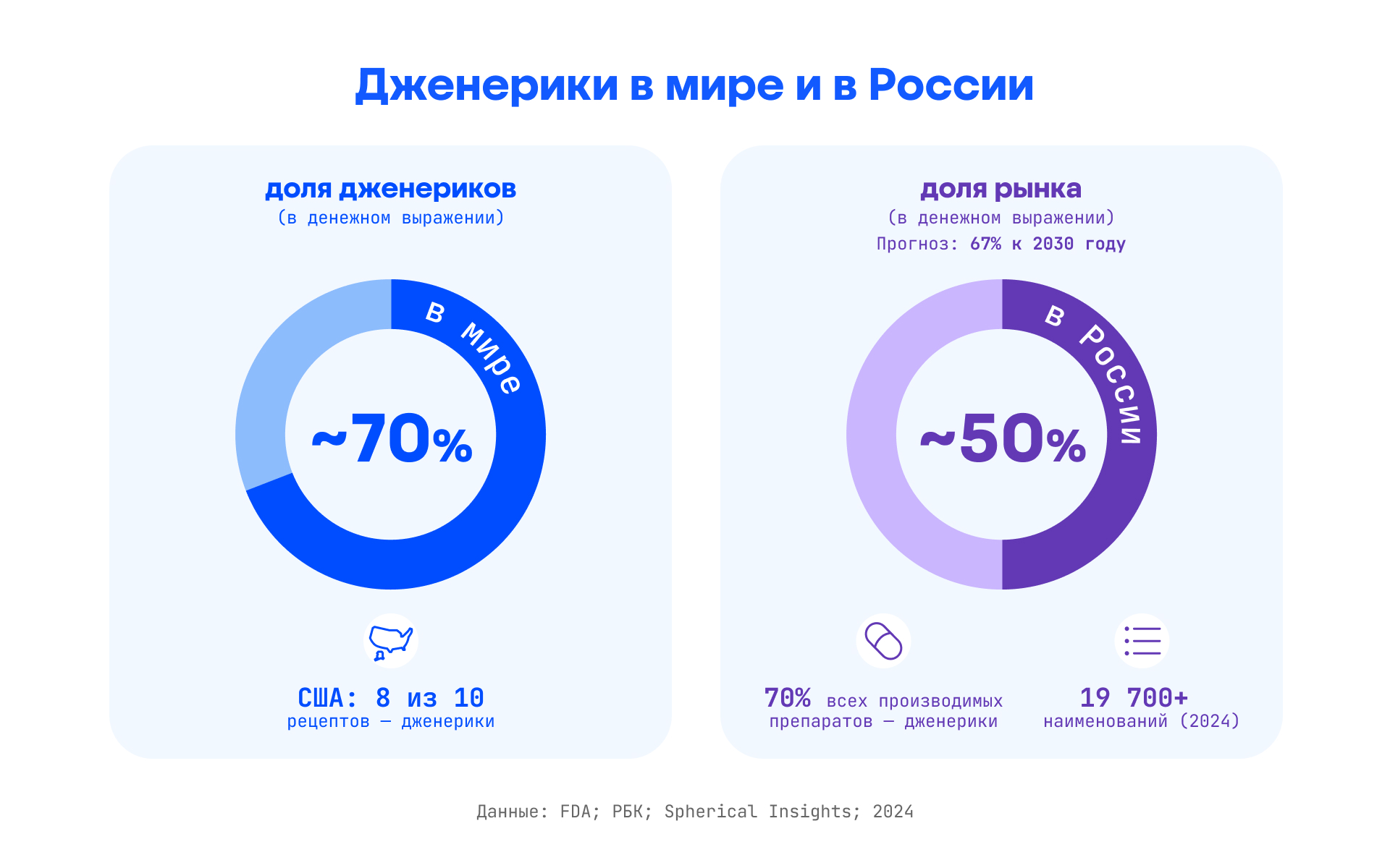 Дженерики (от англ. generic drugs — «общие препараты») — копии оригинальных препаратов, которые начинают производить другие фармкомпании после окончания срока патентной защиты оригинального препарата и (или) срока маркетинговой эксклюзивности. Обычно дженериками называют препараты на основе малых молекул, потому что их химическая формула может быть точно воспроизведена. В отличие от биологических препаратов, о которых мы поговорим дальше, дженерики имеют идентичный с оригиналом состав активных веществ.