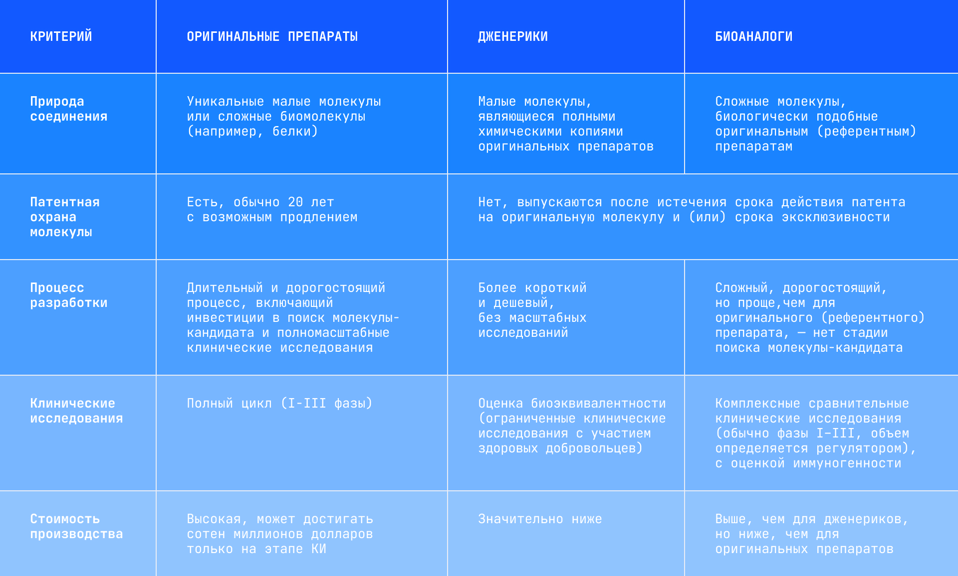 Могут быть оригинальными и разработанными на основе оригинальных препаратов. Последние, в свою очередь, бывают двух типов: дженерики — копии оригиналов на основе малых молекул, и биоаналоги — биологические препараты на основе сложных биомолекул.