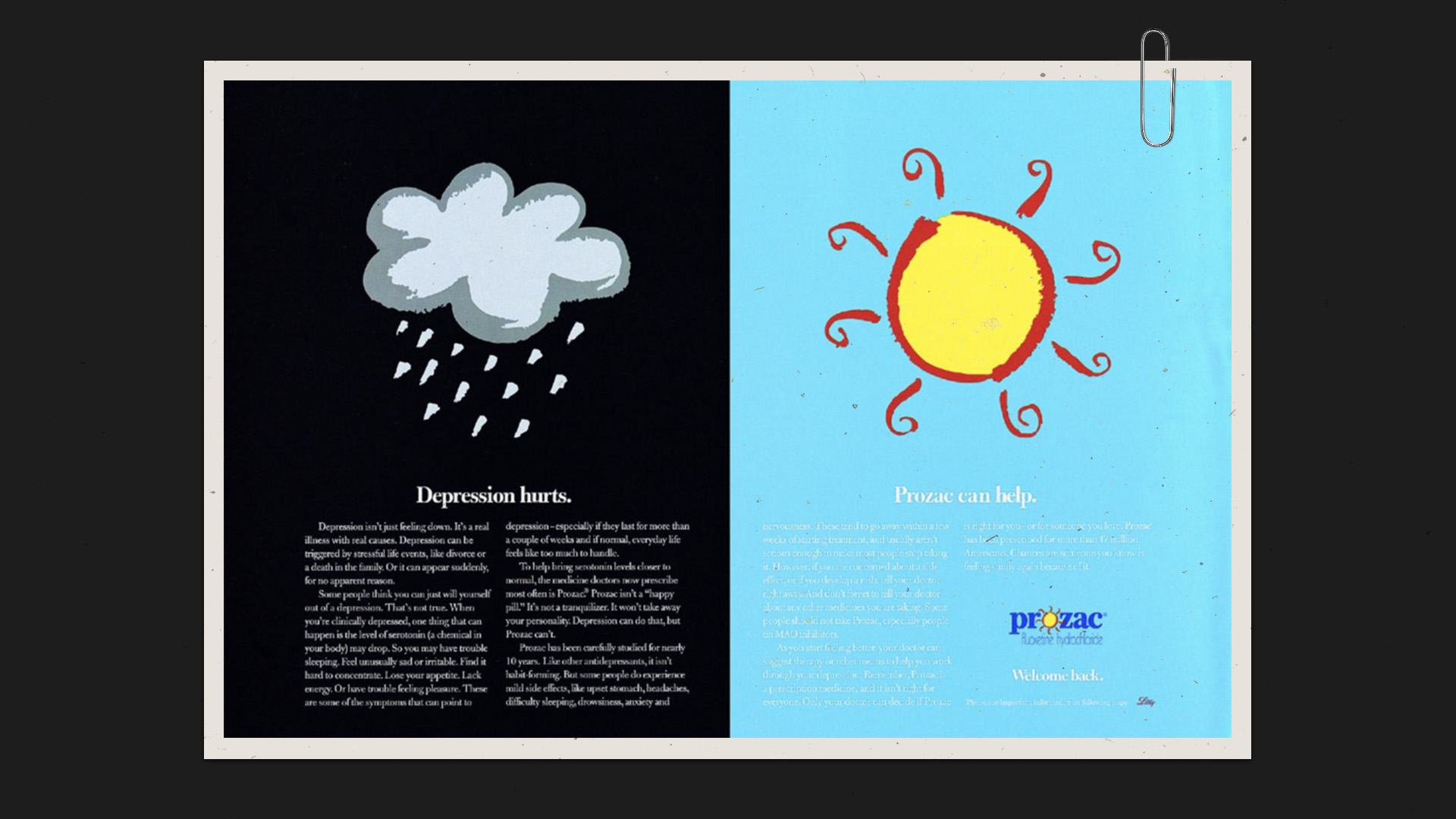 Для плакатов маркетологи выбирали простые метафоры. Они буквально говорили: без Прозака жизнь — грустная тучка, а с препаратом — в жизнь возвращается солнце