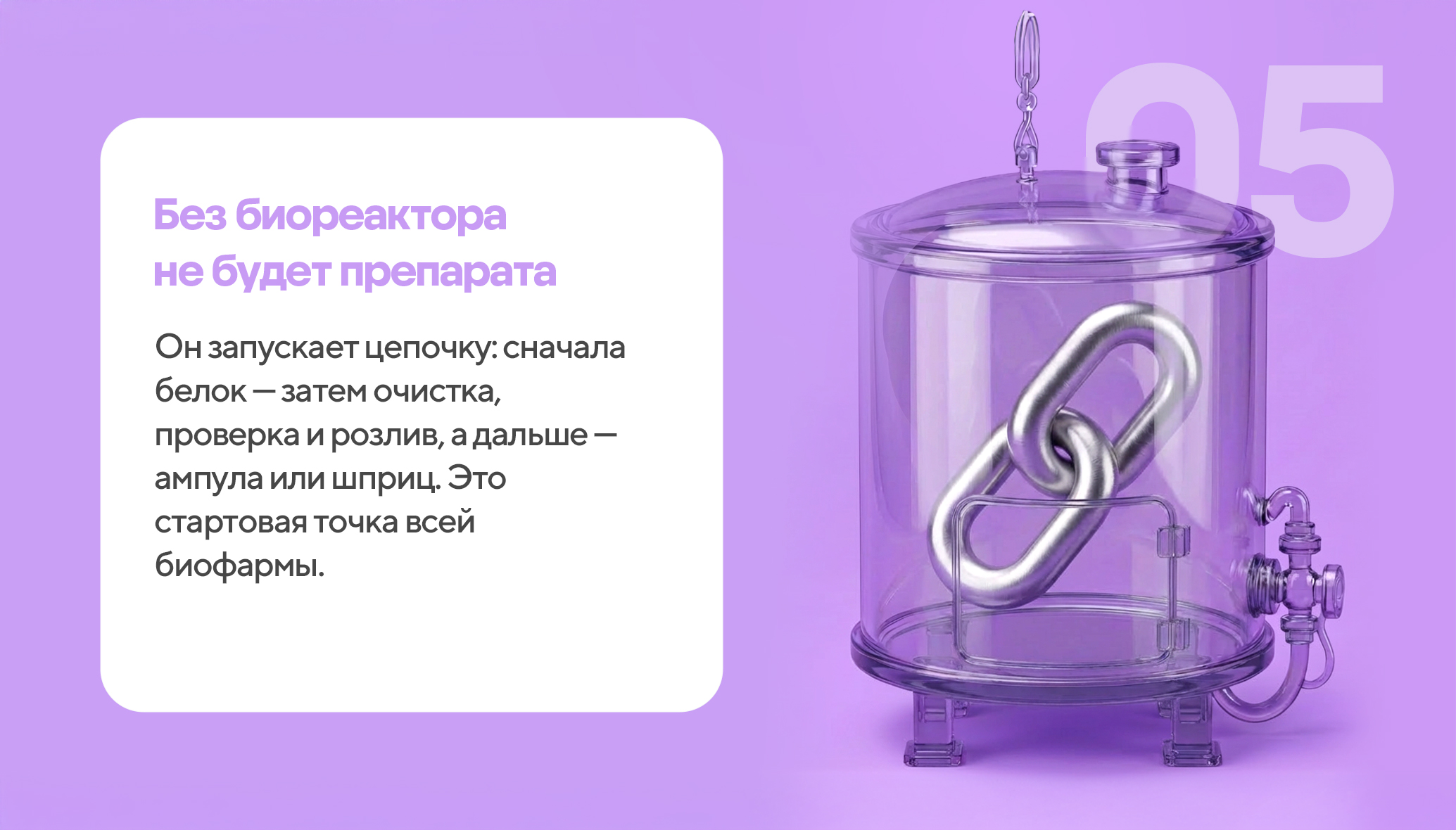 И всё это — благодаря биореактору, где наука, инженерия и биология работают вместе. Ради одной цели: создавать эффективные, доступные, оригинальные препараты.