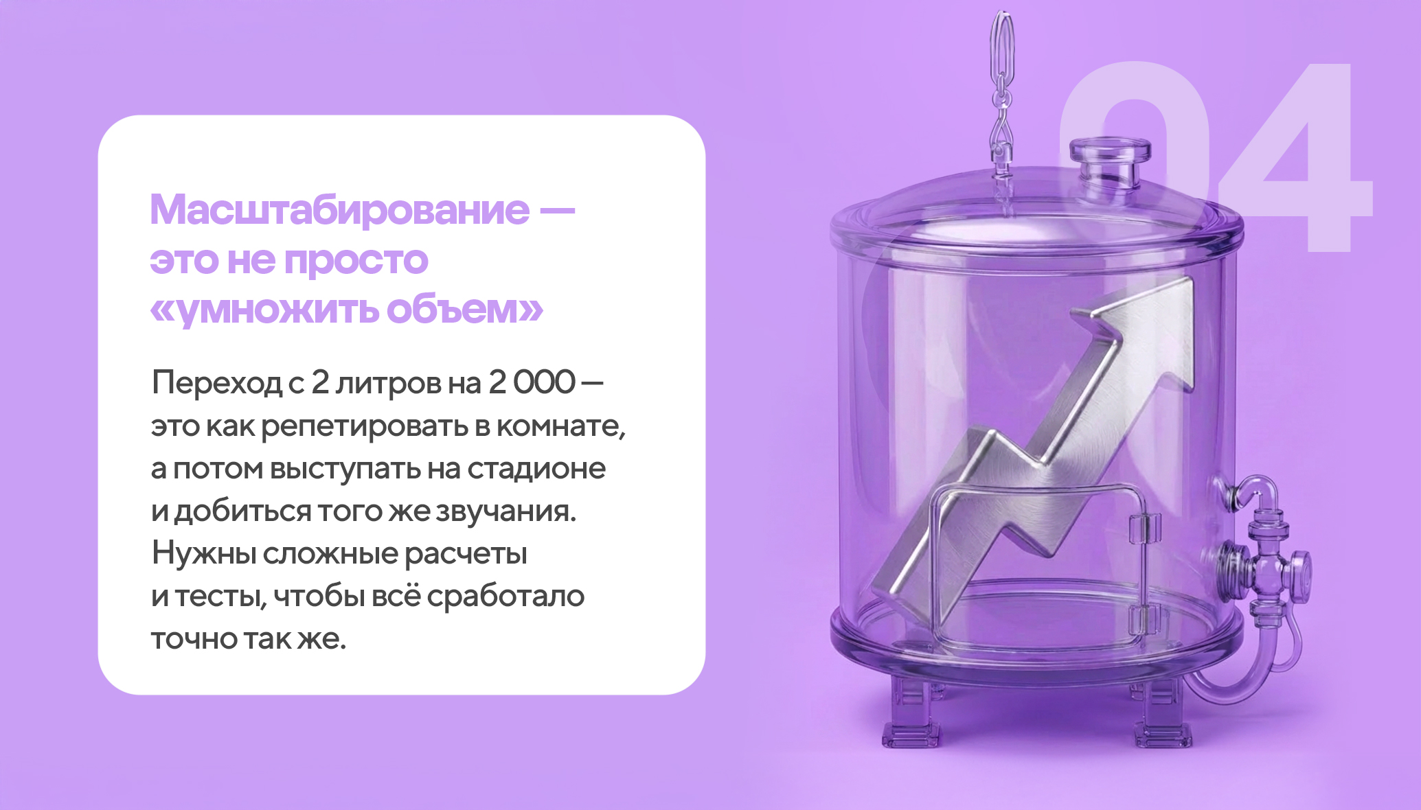 Чтобы получить миллиграммы чистого вещества в лаборатории, нужен мини-биореактор. Чтобы выпустить тысячи доз — производственные установки объемом в сотни или тысячи литров.